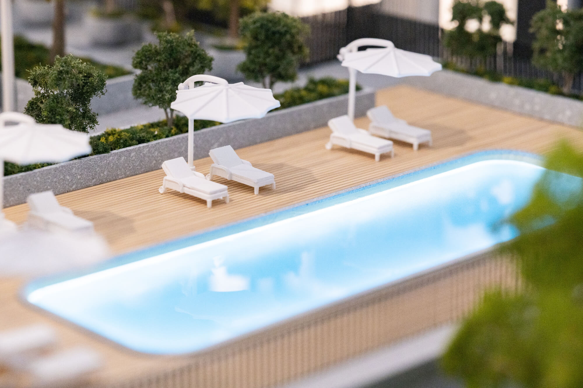 The development features four residential towers, each positioned around a central landscaped garden and amenities area. This private facilities space is designed to provide a sense of calm, with lush greenery and a variety of amenities for residents to enjoy. The garden offers a quiet retreat from the activity of the city, creating a peaceful space to relax and unwind.